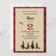 Une invitation à la fête à thème bûcheron pour la fête du deuxième anniversaire d'un garçon. Modèles pour le nom et les détails de la fête. Tartan rouge et noir, motif de flanelle plaid, silhoettes de forêt et faune en noir. Arbres, orignaux, lapin, renard et aigle. Numéro 2 année en motif plaid. Arrière - plan marron clair, beige. Lettres noires.
