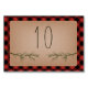 Eine Hochzeitsfeier-Tischnummer-Platzkarte mit einer Abbildung immergrüner Zweige über einem rot-schwarzen karierten und karierten inspirierten Hintergrund.