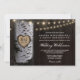 Lumières + Invitations au mariage d'un oiseau sculpté - présente un arrière - plan en bois de grange imprimé avec un bouleau dans lequel vous pouvez "sculpter" des initiales et une date mariage dans. La conception comporte également des lampes à cordes qui brillent.