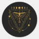 Ein mystisches Design, das eine Lunamotte zeigt, umgeben von geometrischen Formen, Himmelskugeln und den Mondphasen. Lunamotten gehören mit einer Spannweite von 3 bis 4 cm zu den größten Mottenarten Nordamerikas. Erwachsene Lunamotten essen überhaupt nicht und haben daher nur vestigiale Mundpartien und kein Verdauungssystem. Ihr einziger Zweck im Leben ist die Reproduktion. Sie haben nur etwa eine Woche Zeit, um dies zu tun, bevor sie die haben. Die Luna-Motte verkörpert nicht nur den Vollmond in seiner blassen Majestät, sondern auch den neuen Mond in seiner Unklarheit und unaufgedecktem Potenzial.