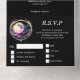 Eine wunderschöne Alleineinmond-Einladung mit Vollmonden und einem Halbmond, die durch leuchtend rosa, lila und blaue, goldene, funkelnde Sterne Set vor einem schwarzen Hintergrund von Mitternacht, der in jede Farbe Ihrer Wahl verändert werden kann, dreidimensional gerahmt zu sein scheinen. Diese generativen Inhaltsgrafiken sind ideal für eine Sternennacht, über den Mond, den Segelmond, eine Galaxie oder ein himmlisches Thema Hochzeit oder besondere Veranstaltung. Im unteren Drittel befindet sich eine Antwortkarte mit personalisierter uAwg, die Sie abschließen können.
