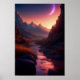 Unter dem beleuchteten Nachthimmel stehen die felsigen Hügel hoch, durch einen rasanten Fluss geschnitten. Der Mond strahlt in einem faszinierenden Schatten von lila und strahlt das bezaubernde Licht der Landschaft aus. Dieses digitale Kunstwerk erfasst eine surreale, nächtliche Szene, die eine andere Weltanschauung ausstrahlt.