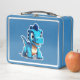 Un petit dinosaure bondé au ventre rond et aux bras minuscules, avec un sourire amical. Ses grands yeux expressifs et ses joues rougissantes lui donnent un look adorable, presque caricatural. Le dinosaure est un vert pastel doux, avec des taches vertes foncées éparpillées dans le dos et la queue. Il porte une petite cravate arc-en-ciel bleu, ce qui ajoute à son charme
