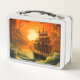 Cette boîte à lunch a une scène de bateau artistique sur elle.