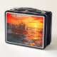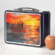 Cette boîte à lunch a un bateau au coucher du soleil représenté dessus.