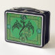 Dragon noir tribal avec ailes de travail de noeud celtique vert. Des nuances de noeud vert et celtique travaillent tout derrière et autour du dragon et du trèfle à quatre feuilles.