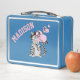 Une mignonne boîte à lunch bleue pour les enfants (garçons ou filles) avec un chat tabby gris et noir envoyant des câlins et des baisers. Utilisez le modèle pour le personnaliser avec le nom de votre enfant. N'hésitez pas à modifier la couleur de la police ou de la police elle-même si vous le souhaitez. © ArianeC Illustrations