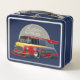Une camionnette colorée avec un design rétro fiction avec de grandes roues et un pare-chocs avant de premier plan est présentée. L'arrière - plan inclut le texte "Custom Rides" dans un emblème circulaire derrière le véhicule.