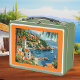Boîte à déjeuner avec une illustration colorée de la côte italienne.