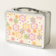 This metal lunch box features a simple yet charming multicolored boho daisy pattern set against a light cream colored background. It also includes a designated area where you can personalize it with a name for that extra special touch.