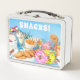 Voici une boîte à lunch amusante avec une variété de délicieuses friandises, dont des beignes, des biscuits, des bonbons et des glaces avec le mot "SNACKS!" en police rétro ci-dessus. La boîte à lunch a un aspect un peu vintage et est parfaite pour le travail ou l'école. Offrez-en un cadeau à un élève pour son retour à l'école ou à un amateur de desserts pour son travail ou comme accessoire fantaisiste.