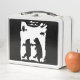 Cette boîte à lunch en métal a une image en noir sur la silhouette blanche de deux ours dansant ensemble sous les arbres dans les bois avec une chouette regardant d'une branche au-dessus d'eux sur le devant et le dos.