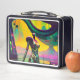 Cette boîte à lunch robot de science-fiction rêveuse comprend deux tableaux du surréaliste américain Ken Gage. Sur le devant se trouve Bridge Over the Robot Kwai. Sur le dos, Rêveur Psychaéronautique. Idéal pour un congrès fourre-tout ou juste une visite de collation régulière à votre sanitarium local.