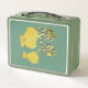 Mosaïque, dessin graphique, avec groupe, à motif rayé, et pochoir, exposé de poissons dans les couleurs vives de ; orange, rouge, jaune, or, taupe, marron, noir et blanc.