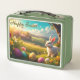 A picturesque spring landscape with rolling hills and blossoming trees stretches out in an idyllic, sunlit valley. A bright white Easter bunny sits attentively in the grass, surrounded by colorful, artfully decorated Easter eggs. The flowers in vibrant colors and the warm golden light of the setting sun lend the scene a peaceful and festive atmosphere. The elegant lettering "Happy Easter" hovers above the scene, underlining the festive mood.