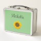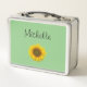 Jolie boîte à lunch monogramme, avec une image de tournesol jaune sur un arrière - plan vert. Avec des lettres personnalisables en noir, vous pouvez ajouter votre propre nom. Idéal pour ajouter une personnalisation à votre repas du milieu de la journée !