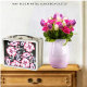 Ce graphique floral, est présenté dans un motif de diamant, avec des grappes de fleurs, pétales et feuilles, en teintes muettes de ; rose, fuschia, lavande, mauve, vert et blanc sur fond de noir.