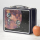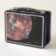 Boîte à lunch en métal amusante avec l'oeuvre originale de Dizzydebbie, d'un robot à l'allure métallique marchant un chien robot dans l'espace, avec une planète à tonalité rouge dans l'arrière - plan. Idée cadeau idéal pour tout amateur de science-fiction.