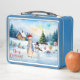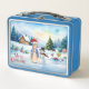 Peter the rabbit in a snowy landscape with ginger bread house, snowman and lolly pops