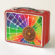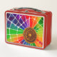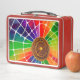 Cette boîte à lunch a une toile arc-en-ciel dessus.