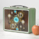 Turquoise lenses with antique watch with brass gears and golden keys on rusty, brown background. Steampunk style.