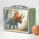 Un Tricératops marche à travers une forêt préhistorique sur cette boîte à lunch pour un petit garçon ou une petite fille qui aime les dinosaures.