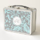 Schönes und elegantes Vintages hellblaues Blumenmuster auf grauem Hintergrund. Ausgereifte und feminine Metalllunchbox mit Monogramm auf weißer Rundform. Alles ist anpassbar: Sie können die Initialen (Schriftart, Farbe, Größe und Position) und das Design (Größe und Position) einfach ändern, indem Sie auf die Schaltfläche Anpassen klicken. Matching Gefälligkeitsbox, Kissen, Gepäck, Gepäckstück, Schuhe und mehr... Vergessen Sie nicht die gesamte Sammlung Vintager Blumenmuster mit Monogramm.