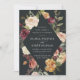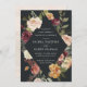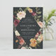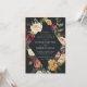 D'élégantes invitations à des mariages fleuris présentent vos détails nichés à l'intérieur d'un losange allongé entouré de roses d'aquarelle, de mamans et de verdure dans des couleurs automnales rustiques comme la pêche, l'ivoire, le rougissement, le bordeaux et le vert. Un riche arrière - plan noir apporte profondeur et élégance à cette invitation chic aux mariages d'automne ou d'hiver.