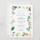 Whimsical Baby Dusche Einladung mit sattem Dschungel Pflanze Leben und tierischen Illustrationen wie Tiger, Papagei, Faultier, Affe und Schlange.