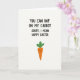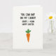 Diese Karte zeigt einen hellen weißen Hintergrund mit einer mehrzeiligen, witzigen Grußformel, die oben in einer dicken, casualen serifenlosen Schriftart in dunkler Schrift gesetzt ist, um einen starken Kontrast zu erzeugen. Die erste Zeile liest sich wie ein koketter Auftakt, der schnell in einen saisonalen Ostergruß umschlägt und dem Layout einen freundlichen Augenzwinkern verleiht. Unter dem Text sitzt eine einzelne Cartoon-Wurzelgemüsefigur, zentriert und etwas größer als die Schrift darüber, als ob sie dem Witz lauscht 🐰. Das Gemüse hat eine warme orange Kegelform, die mit drei einfachen grünen Blättern bekrönt ist, und sein winziges Gesicht besteht aus zwei schwarzen Punkteaugen und einem gebogenen Lächeln. Sanfte rosa Backen färben seine Wangen und verleihen ihm einen schüchternen, liebevollen Ausdruck, als ob es mit dem Leser ein privates Lachen teilt 🌷. Der weite, offene weiße Raum darum herum hält alles luftig, wobei das Orange und Grün klar gegen den Hintergrund hervortritt. Die Nachricht bleibt