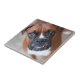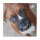 Junger Boxerhund mit einem wenig underbite, das neugierig der Kamera betrachtet.