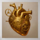 A stunningly detailed full-color illustration focusing on the rich, reflective textures of the materials. The internal mechanisms of the anatomical organ are rendered in highly polished brass and copper, emphasizing the intricate, light-catching detail of the clockwork and metallic housing.