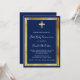 Modernes, elegantes und einladendes Hotel. Ein marineblau mit einem Kreuz dekorierter Hintergrund, Imitate goldene Rahmen. Personalisieren und fügen Sie einen Namen und Details. Weißer Text.