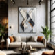 Abstrakte Kunst, die edle Marmorarten in weißen, schwarzen und grauen Tönen mit Bronzedetails kombiniert. Diagonale geometrische Formen erzeugen Tiefe und Bewegung. Perfekt für moderne Dekoration, die nach Raffinesse, Minimalismus und einer hochklassigen architektonischen Ästhetik mit zeitloser Eleganz strebt.