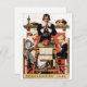Eine in traditioneller Pilgerbekleidung gekleidete Familie verbeugt sich beim Erntedank im Gebet. Der Tisch ist voll mit Nahrung, einschließlich Truthahn, und ein Regal im Hintergrund hält eine Kerze und Obst.