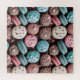 Niedliches Rätsel für Makaronfans. Niedlicher, weißer, blauer, rosa und schokoladenbrauner Makaron mit Sprinklen.