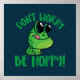Ein fröhlicher Cartoon-Frosch mit großen ausdrucksvollen Augen wird begleitet von dem spielerischen Text Don't Make Hoppy in hellgrün. Die rosa Zunge des Frosches klebt ein bisschen aus. Der Hintergrund ist tiefblau, was den Frosch und den Text lebendig hervorhebt. Gutes Geschenk für Froschliebhaber. Tags: Frosch, Amphibien, Cartoon, Spaß, fröhlich, lustig, Stierfrosch, Zitat, fröhlich, niedlich, sonderbar, wackelig, grün, charmant, spielerisch, fröhlich, lächelnd, text, freundlich, blau, zunge, tierisch, albern, inspirierend, motivierend, lebhaft, verführerisch, biotisch, Typografie