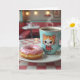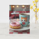 Sage einem Freund oder einem Familienmitglied mit dieser süßen Karte. Im Vordergrund steht ein Erdbeerdonut mit Sprinklen und eine niedliche Tasse Kaffee mit Kawaii-Katze auf einem Tisch am Tisch. In der Karte steht ein niedlicher Wortgefecht, der sagt: "Mach dir keine Sorgen, sei glücklich."