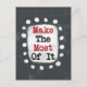 Das fette Textlesen "Make The Most Of It" zentriert sich auf einem grauen Hintergrund. Der schwarze Text sitzt auf einem weißen Rechteck mit großen, texturierten weißen Punkten um ihn herum, was einen spielerischen Kontrast zu der soliden Hintergrund der Farbe bietet.