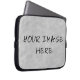 Machen Sie Ihren eigenen 10" Laptop-Sieb! Um Ihren Laptop-Sleeve zu erstellen und zu entwerfen, laden Sie einfach Ihre Bilder hoch, um den Grauen Vorlagenhalter zu ersetzen. (1 Rechteck im Horizontalen Landschaftsmodus) Hochladen, Kunst, Fotografie, ... alles, was Sie scannen und digitalisieren können. Hergestellt aus leicht wasserresistentem Neopren. Um weitere Designelemente, Bilder oder Text hinzuzufügen, verwenden Sie die Schaltfläche "Anpassen". Dann laden Sie Bilder von Ihrem Computer hoch (jpg, png, gif, tiff). Unter der Schaltfläche Bearbeiten können Sie eine Hintergrundfarbe auswählen, wenn Sie Leerzeichen haben, ansonsten ist sie weiß. Fügen Sie dann Text hinzu. Wählen Sie Ihre Lieblingsfarbe, -größe und -art aus. Wenn Sie eine PNG-Bilddatei mit transparentem Umkreis hochladen, können Sie sogar Bilder in die Ebene verschieben. Zazzles Design Tool ist fantastisch.