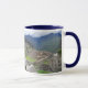 weiße Schale mit machu picchu auf ihm mit blauer Kante und Griff