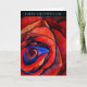 Parfait pour la Saint-Valentin avec un design artistique original de peinture aquarelle de Sacha Grossel de grande, étroite focalisation, macro style rose rouge avec points forts bleus et salutation de la Saint-Valentin. Cette fleur anglaise traditionnelle aux pétales cramoisis a un design coloré intense et lumineux qui traduit l'abstraction de la forme botanique et des thèmes de l'amour et de la passion.