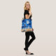 Tote Tag in einer Illustration einer einsamen jungen Frau in einem blauen Kleid, stehend am Rande eines Strandes, Blick auf den Vollmond reflektiert auf dem Ozean. Der ruhige Nachthimmel ist mit Sternen übersät.