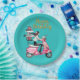 Ein Mädchen, das auf einem rosa Roller mit vielen Geschenken fährt. "Happy Birthday" Text.