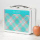 Eine ästhetische hübsche aquamarin-blau und rosa karierte Metal Lunchbox. Dieses Lunchpaket zeichnet sich durch ein skurriles und doch traditionelles aquamarines Blau- und Rosatmotiv aus. Dieses schöne Design bietet auch einen Ort zum Anpassen und Hinzufügen eines Namens. Das ist der perfekte Rückweg zum Schulangebot für das Mädchen auf der Schulliste!