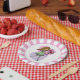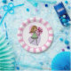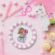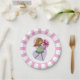 Lustige rosa und weiße Party-Teller mit einem süßen, verspielten Mädchen mit langen, fließenden gelben Haaren, das ein grünes Kleid und gestreifte Strümpfe trägt. Sie hält einen wunderschönen Strauß roter Rosen in ihren ausgestreckten Armen. Der Hintergrund besteht aus einem rosa und violetten Liebesherz.