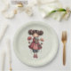 Pappteller mit einem niedlichen Retro-Motiv mit einem fantasievollen Mädchen mit rosigen Wangen und Blumen im Haar. Trägt eine grüne Froschpuppe.