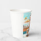 Lächelndes Mädchen mit einer entspannenden Kaffeepause, Cappuccino. Künstlerisches Image für einen erholsamen und unterhaltsamen Aufenthalt mit sonniger Meereskulisse.
