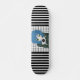 Ein cooles Skateboard mit fett- und modernen schwarz-weißen Streifen, einem coolen Gingham-Muster und einem Comic mit einem Tablett in den Händen mit einem Stille-Symbol-Aufkleber darauf.