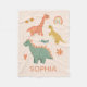 Diese niedliche und skurrile Kinderdecke zeigt eine grüne und rosa Dinosaurier-Illustration, inklusive T-Rex, Stegosaurus und Jurassischen Dschungelwüsten Pflanze und Blume, und kann mit dem Namen Ihres Mädchens personalisiert werden. Das perfekte Dinosaurier-Geschenk für jeden Dino-Liebhaber!